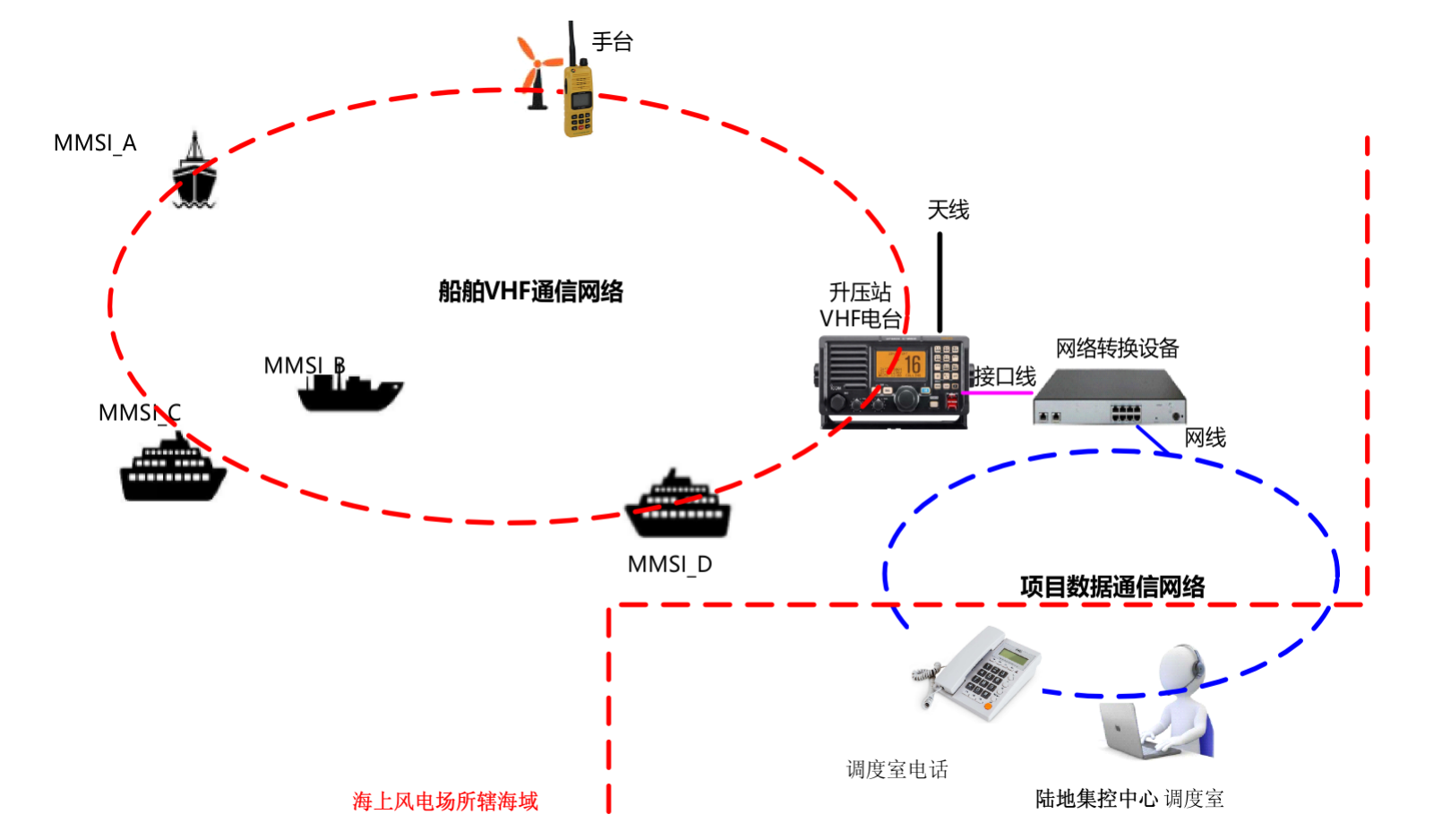 當社會船只誤駛入海上風場區域,或在海纜鋪設沿途拋錨作業,有損壞電力設備設施或傳輸線纜的風險,陸地集控中心調度室發現船只侵入后,目前的語音通訊解決方案對船只進行驅離效果不好。項目海上作業執行期間,陸地集控中心需要與駛入海上風場區域的交通或施工運維船只保持通訊狀態,并進行調度指揮。由于語音通訊方式效果不好,作業執行期間存在一定的風險隱患。