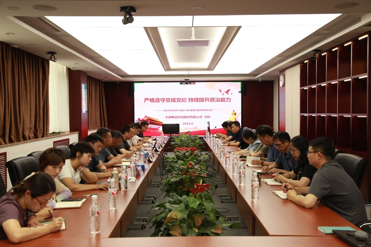 2024年6月28日,大唐電信黨委書記、董事長劉欣為公司黨員干部講授《嚴格遵守黨規黨紀 持續提升政治能力》專題黨課。黨課由大唐電信黨委副書記、總裁冉會娟主持。