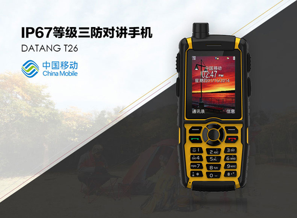 T26是一款TD-SCDMA制式的三防對講手機,采用雙色注塑工藝,已通過IP67級認證,配備2.4英寸QVGA點陣TFT屏幕和2400mAh大容量電池,保證T26的屏幕在戶外清晰可見的同時兼顧長時間續航能力。其一鍵開啟對講和一鍵SOS功能為行業用戶提供了更為人性化的操作體驗。T26支持中國移動PoC對講業務和GPS功能,可將用戶自身信息通過后臺上網定期上傳到專屬服務器,便于服務器管理員對終端進行實時位置管理和調度,還可靈活選擇高保真對講耳機、備用電池、背夾。