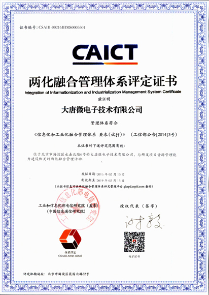 作為大唐電信旗下專業從事集成電路研發、生產的企業,大唐微電子高度重視信息化建設,在經營管理活動中廣泛采用ERP、OA、配置管理、EDA等信息化管理系統及工具,有著良好的信息化基礎。此次,大唐微電子順利通過兩化融合管理體系評定,是對公司信息化工作的肯定。未來,公司將繼續把信息化作為企業的內生發展要素,推進數據、技術、業務流程、組織結構的互動創新和持續優化,充分挖掘資源配置潛力,不斷打造信息化環境下的新型能力,形成可持續競爭優勢,實現公司創新發展、智能發展和綠色發展。
