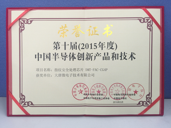 在2016年中國半導體市場年會期間,大唐電信旗下大唐微電子自主研發的指紋安全處理芯片(DMT-FAC-CG4P)一舉獲得“第十屆(2015年度)中國半導體創新產品和技術獎”。該獎項由中國半導體行業協會、中國電子材料行業協會、中國電子專用設備工業協會與中國電子報社共同評選,以表彰中國半導體企業在2015年的產品和技術創新成果,加快提升中國半導體產業創新能力和競爭實力。