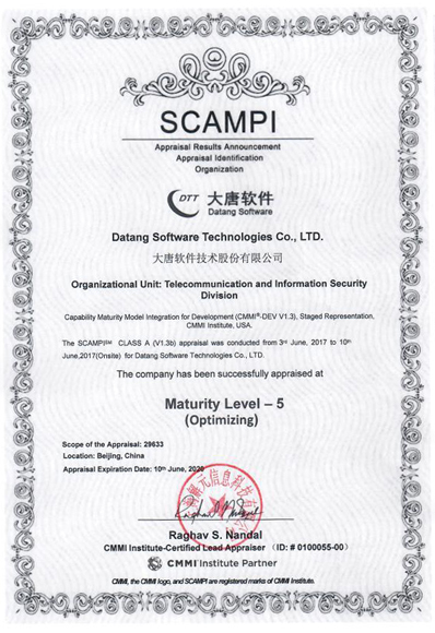 大唐軟件是國內領先的行業應用軟件及系統集成整體解決方案提供商,是國際電聯云計算、大數據標準主要制定單位之一,公司聚焦在運營商、信息安全、智慧城市、水利、教育、IT服務等信息化領域,致力于為客戶提供頂層架構設計、規劃咨詢、方案設計、行業應用及大數據分析管理軟件開發、軟硬件一體化產品提供及實施、系統集成及信息安全等端到端的一攬子解決方案。CMMI 5級評估的順利通過,為公司在方案和產品的持續創新和質量提升方面奠定了良好的基礎。