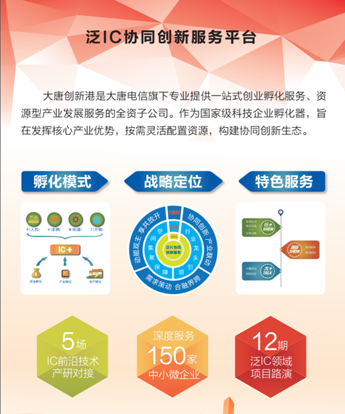 大唐創新港通過整合大唐電信在泛IC產業領域的核心資源,搭建行業共性技術平臺和專業檢驗檢測平臺,通過定制化、專業化方式,為泛IC產業鏈上的企業提供技術創新服務,先后獲得國家級科技企業孵化器、中關村國家自主創新示范區特色產業孵化平臺等資質認定。同時,依托自有科技產業園,大唐創新港與國內外18家知名大企業共同發起大企業開放創新聯盟,實現優勢互補,資源整合。
