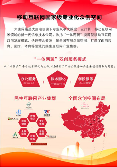 大唐電信作為最大股東的大唐網絡,聚焦民生改善與行業升級的信息化服務,構建了以安全可信的“中國云”平臺為主體,369云工廠眾創空間體系和369云基金投融資體系為兩翼的“一體兩翼”資源型移動互聯網創新發展模式,并在北京、西安、大連、天津、南昌、太原、陽泉、重慶等地落地雙創基地,根據當地政策導向和產業發展,構建垂直領域產業集群,助推地區雙創發展。目前,大唐網絡已被授予移動互聯網國家級專業化眾創服務平臺,是國家發改委認定的國家重點支持項目。