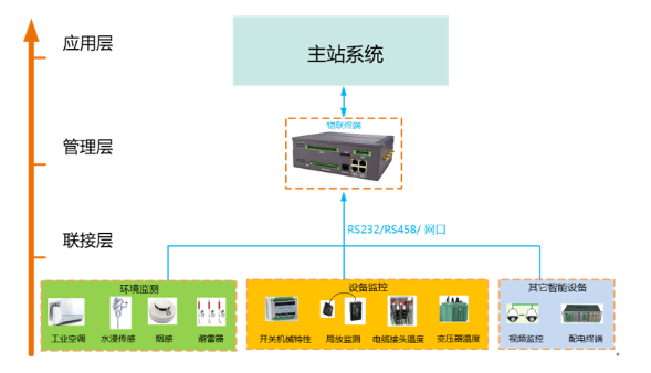 雄東片區開關站的數據采集以“邊”側設備智能物聯終端為核心,實現各種感知終端快速接入物聯網平臺,實時監測設備的工作狀態,集電參量采集、環境監測、重要節點溫度監控、局部放電監測、全景可視化等智能化功能為一體,可遠程對設備運行狀態進行監控,進而降低設備故障發生頻率。對頻率較高的故障,通過邊緣計算分析其趨勢性,分析故障發生原因,科學評估設備狀態以減少運維工作量,可為用戶提供更好的運維服務。