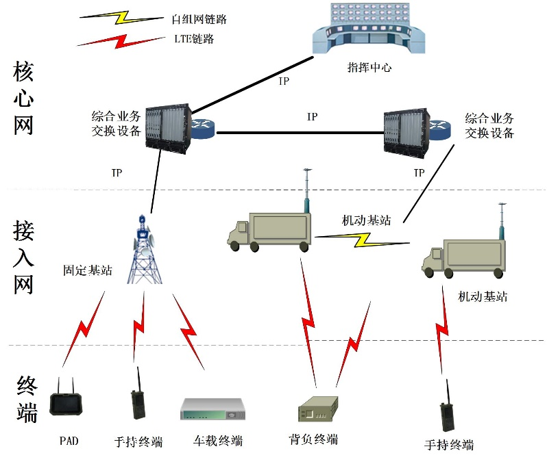 專用移動通信系統是基于4G/5G通信標準,針對復雜電磁環境下的遠距離覆蓋通信需求,對移動通信體制、設備進行定制化開發和改進,作為固定網絡的機動延伸,為覆蓋區域的用戶提供通信保障。系統主要包含核心網設備、固定基站、機動基站以及車載、背負、手持等各類終端。